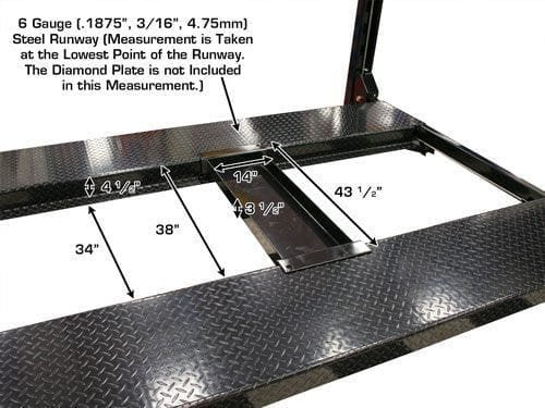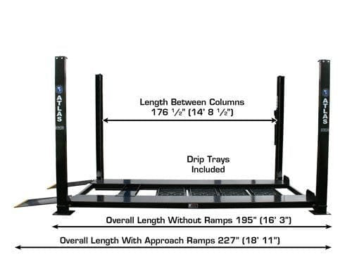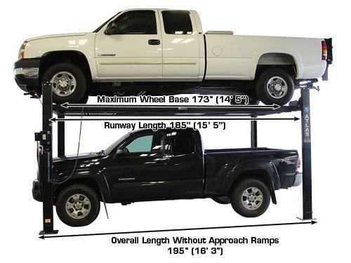 The Atlas® Garage PRO8000EXT-L features the extra lifting height of the PRO8000EXT but is also 20 inches longer and 3 inches wider. Or to compare to the original, the Garage PRO8000EXT-L is 20 inches longer, 3 inches wider, and 14 inches taller than the standard Atlas® Garage PRO8000! The extra runway length will accommodate almost all of the longer wheelbase pickup trucks, except duallys. This is because the dual rear wheels are TOO WIDE to fit between the column lock assemblies. Check out the Atlas® Garage PRO9000 if you need a portable lift for your dually!