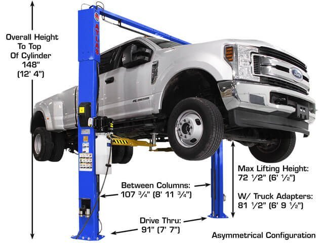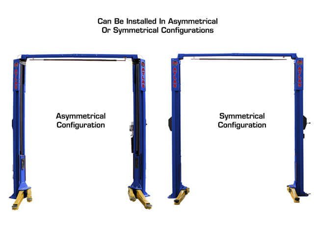 The Atlas® Platinum PVL10 can be installed with the columns positioned symmetrically or asymmetrically. When the columns are installed in an asymmetric configuration exiting and entering the vehicle is easier and reduces the chance or getting dings or scratches in the door. When the columns are installed in a symmetric configuration the width between the columns is wider, allowing wider trucks and SUVs to use the lifts with ease. Both column configurations offer easy vehicle access and superior vehicle lift point support due to the three stage front arm design.